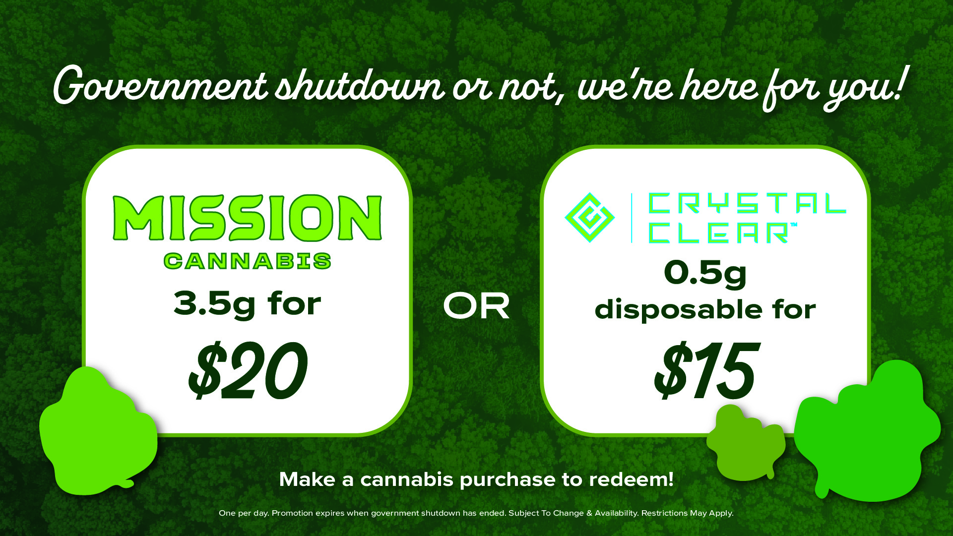 At Mission, we think every day’s a great day to save big on cannabis! Not only do we provide unbeatable prices on excellent products, but you can always find daily and weekly deals, BOGO specials, and so much more.