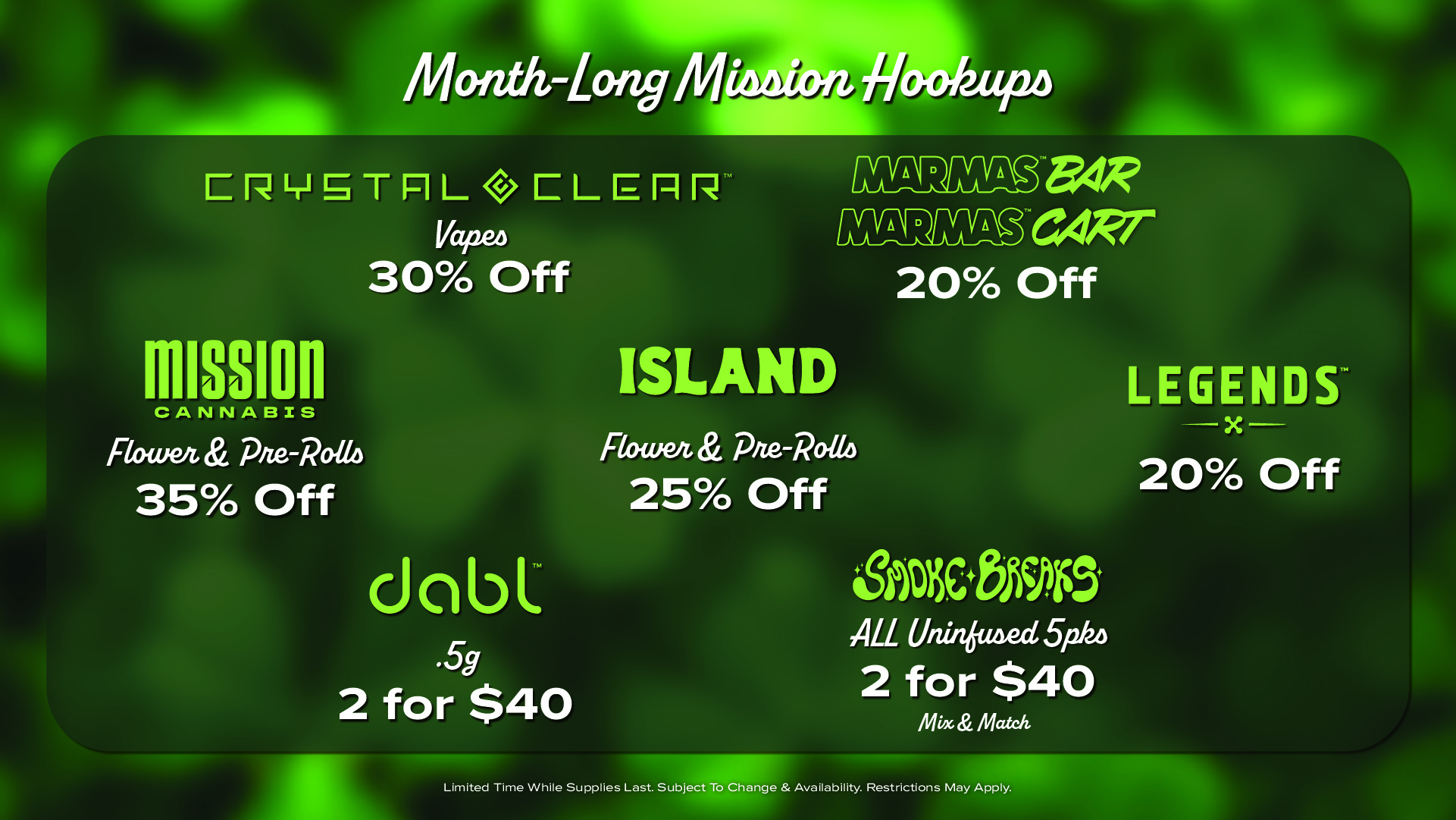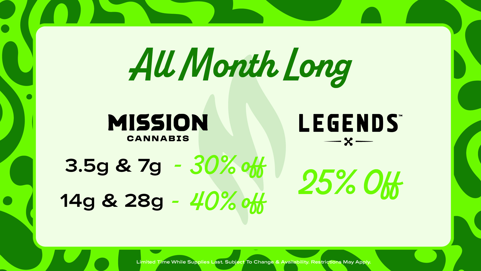 Love saving on weed? We do too! That’s why we offer unbeatable prices and a rotating lineup of daily and weekly deals. From BOGO specials to discounts on pre-rolls, edibles, vapes, and more, there’s always a way to save at Mission Dispensaries.
